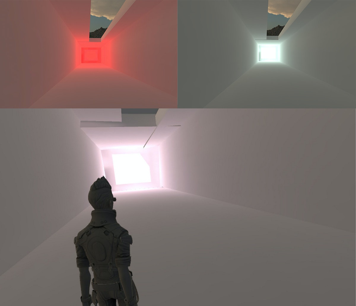 Using Unity and open source development hardware, I created an atmospheric space that can change depending on the user’s biosignals, as well as the amount of pressure they apply to sensors. To build it, I used Arduino and the eHealth platform, which can process the signal from a user’s heart rate, electrodermal activity, or breathing. In this case, I used the ECG sensor reader and developed a little piece of code that would translate the voltage signals into beats per minute, which were then sent directly to Unity via Serial. In Unity, I wrote a script based on Dyadica’s open code that constantly reads the input from the sensors and updates the scenario in each frame. For example, when the heartbeat goes up, the light in the virtual reality world changes to a more soothing blue; when it goes down, the illumination flashes and changes to red. The idea behind this particular interaction is to test whether changing color or lighting patterns will affect the user’s mood, either calming him down, or further agitating him.